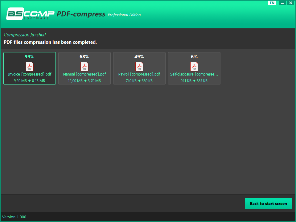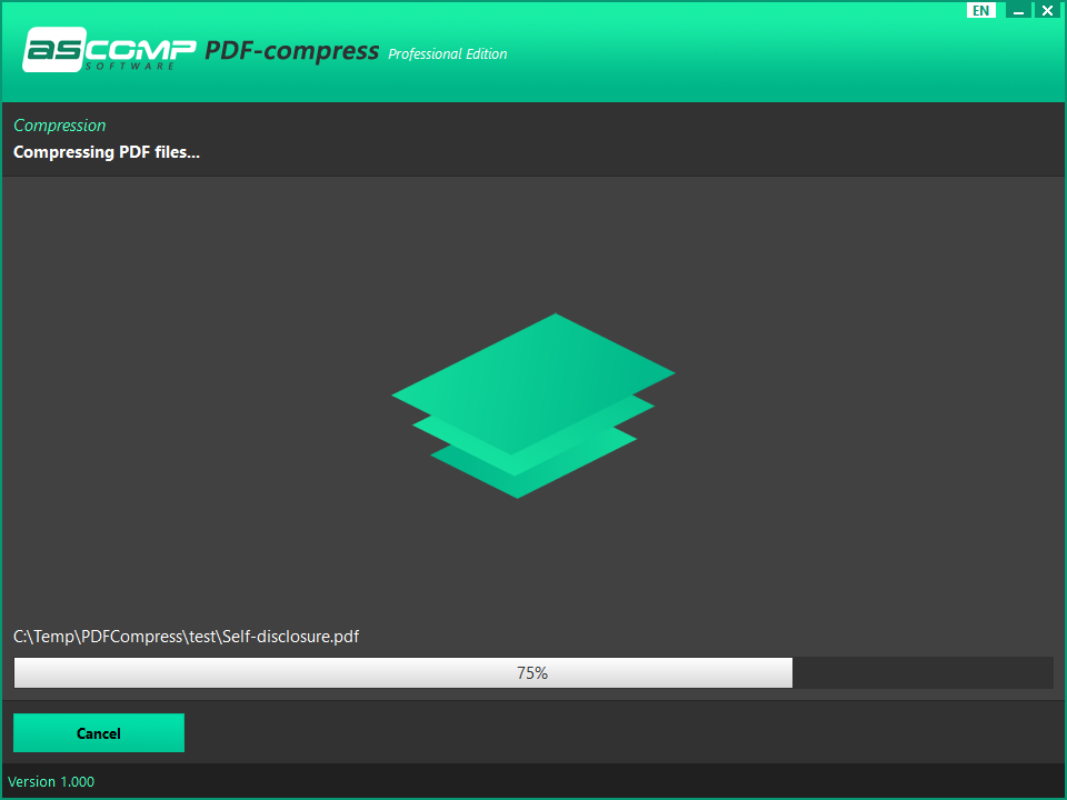 With PDF-compress you can optimize your PDF files so that they do not take up more storage space than absolutely necessary. Depending on the structure and content of the PDF document, compression rates of up to 95% can be achieved. In a test with over 1,000 randomly selected PDF files from different sources, an average compression rate of almost 50% was achieved.