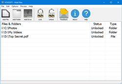 Hide Files is a lightweight app that lets you add files/folders to the program's window, as in the screenshot above on this page. When you select a file/folder and click the Lock button the selected files/folders are copied to a database in a folder in C:\ and the originals are deleted. Encryption is available with the app advising that it's slow.